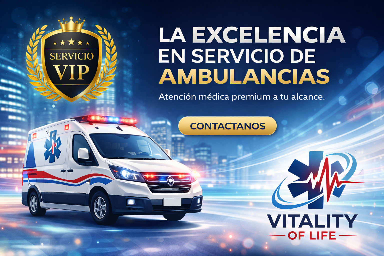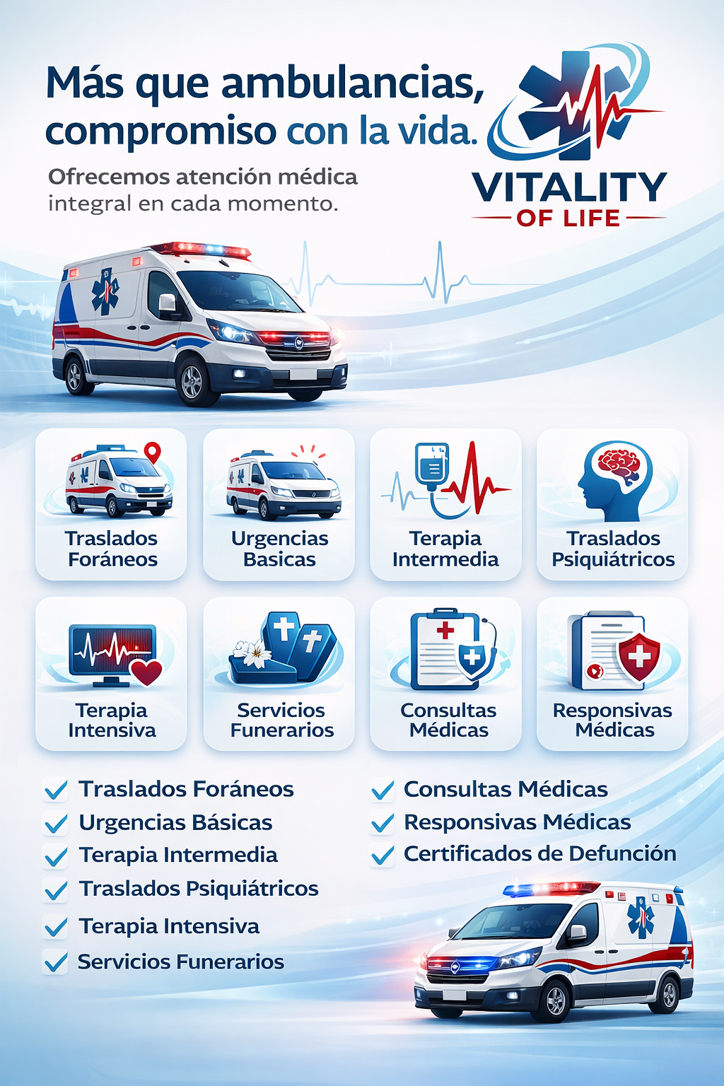 En Vitality of Life sabemos que cada traslado es una historia, una familia y una vida que merece cuidado. Brindamos atención médica prehospitalaria segura, humana y profesional, con respuesta rápida, unidades equipadas y personal capacitado para emergencias, traslados y atención médica integral.